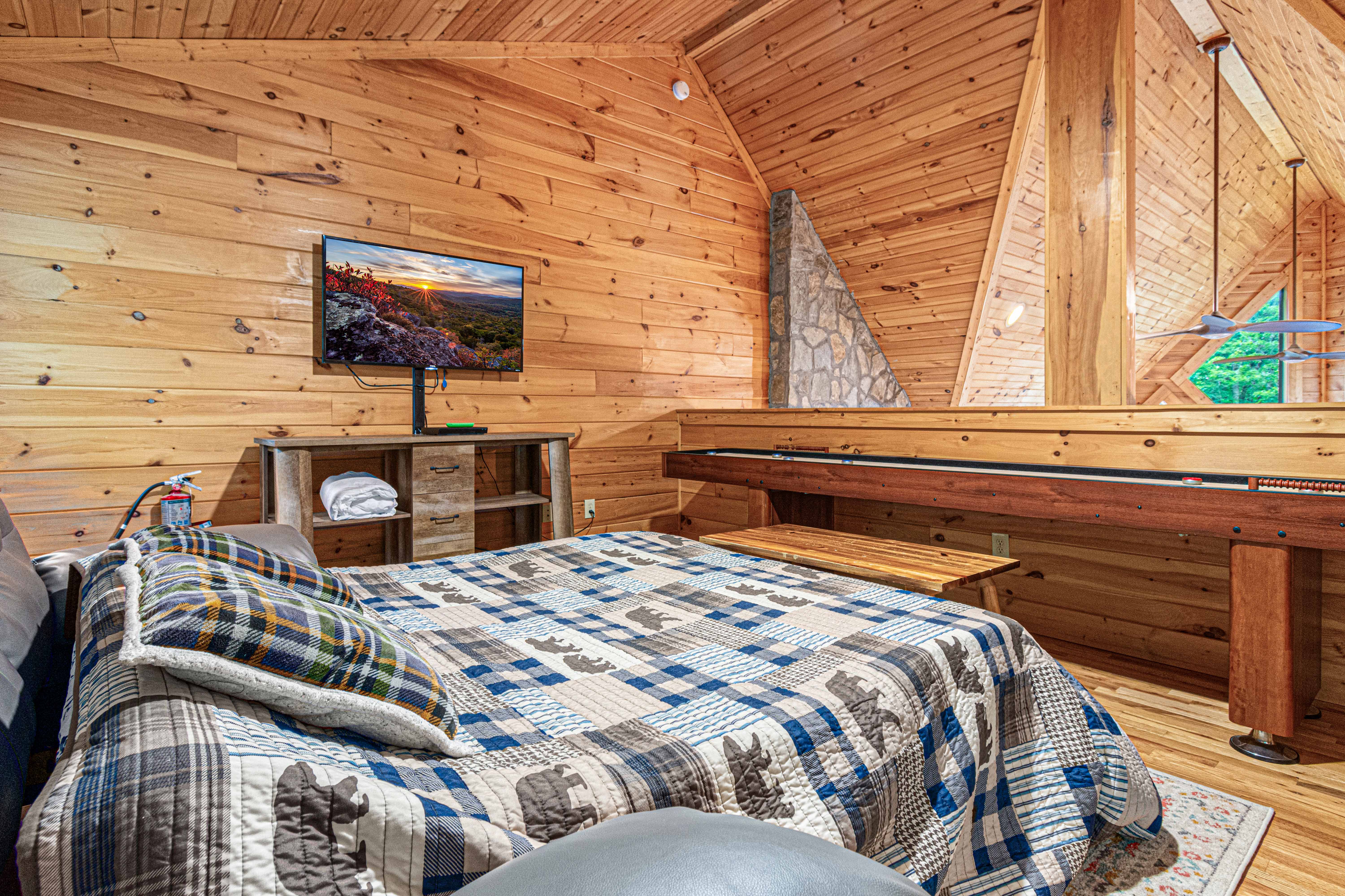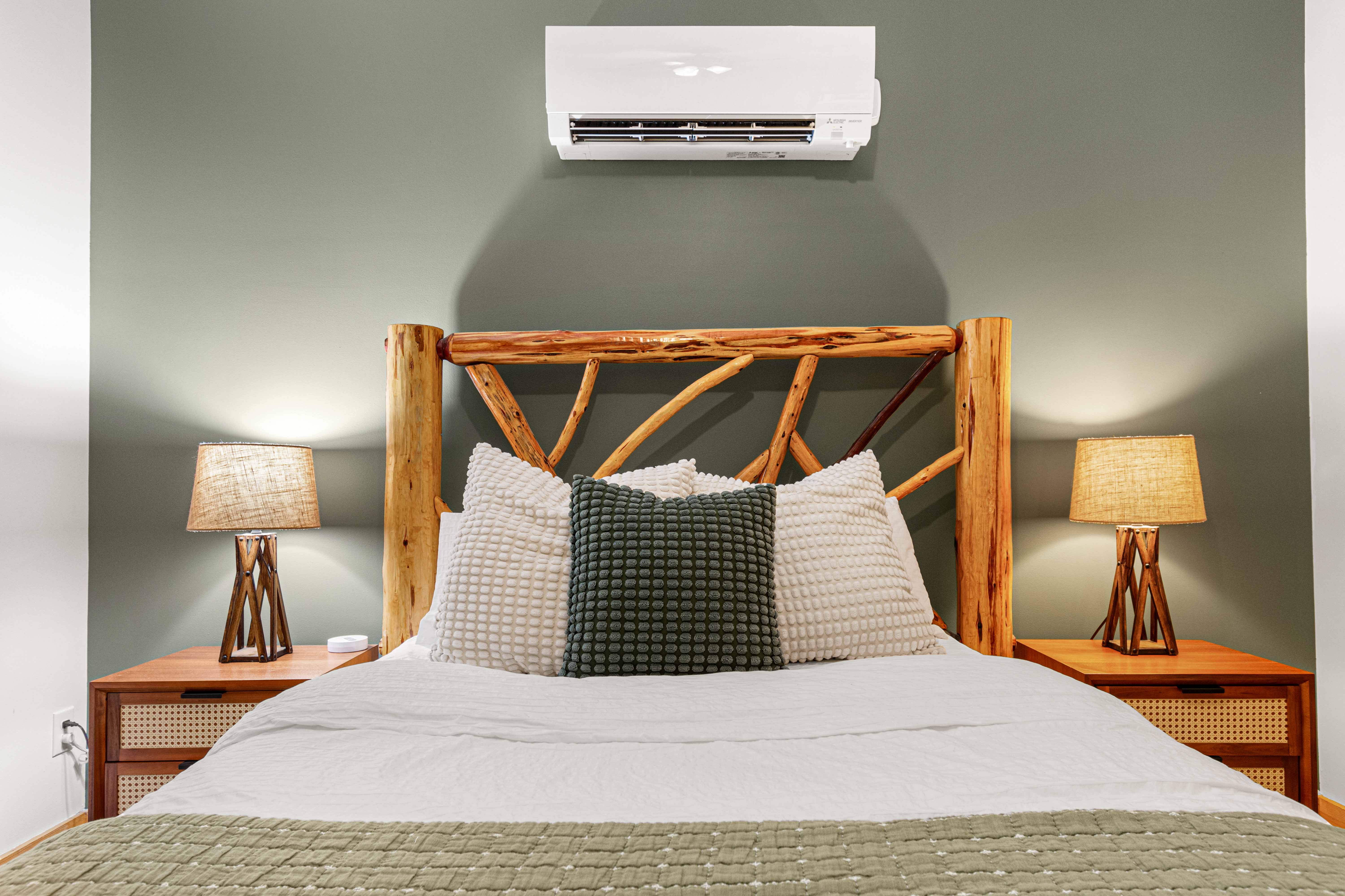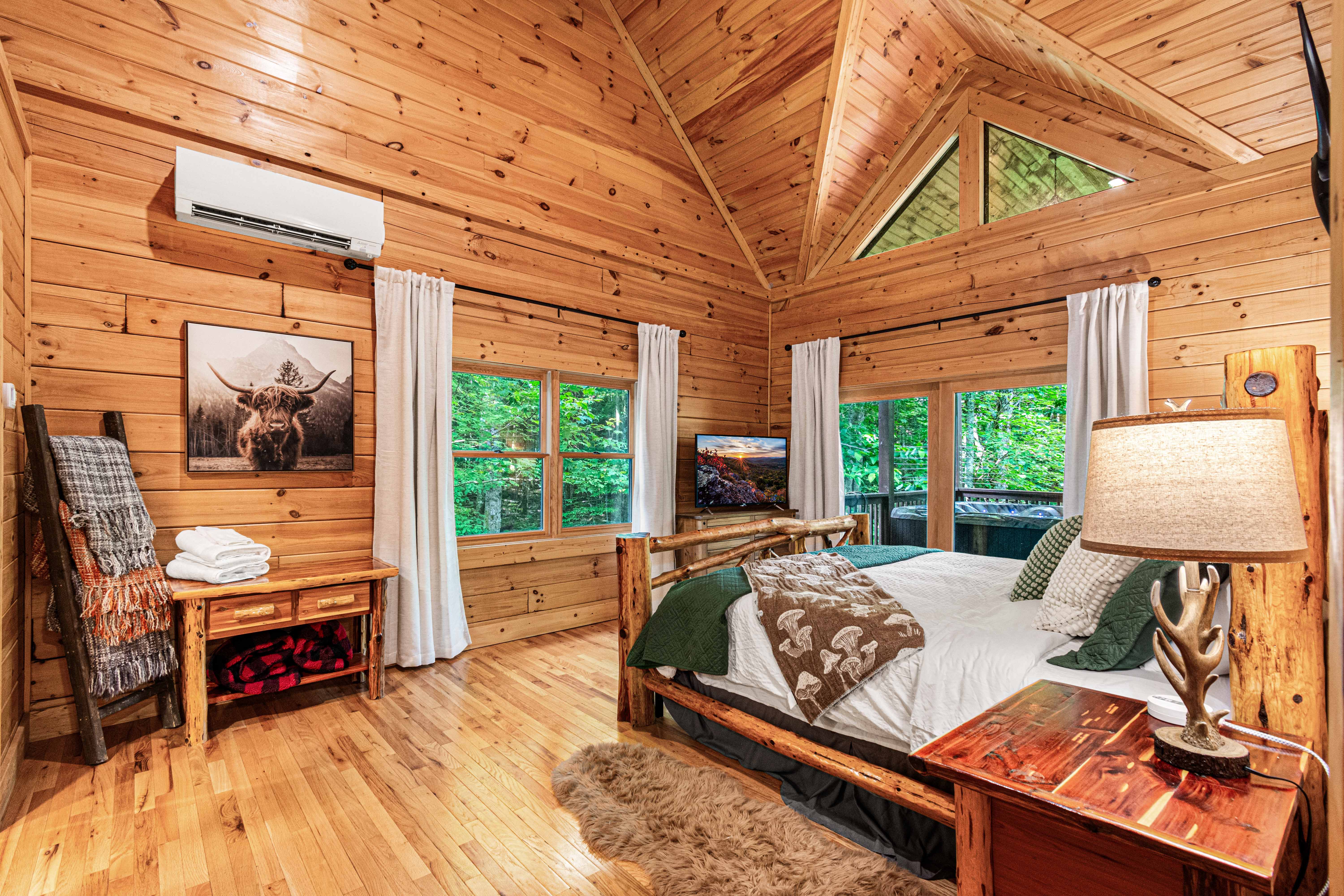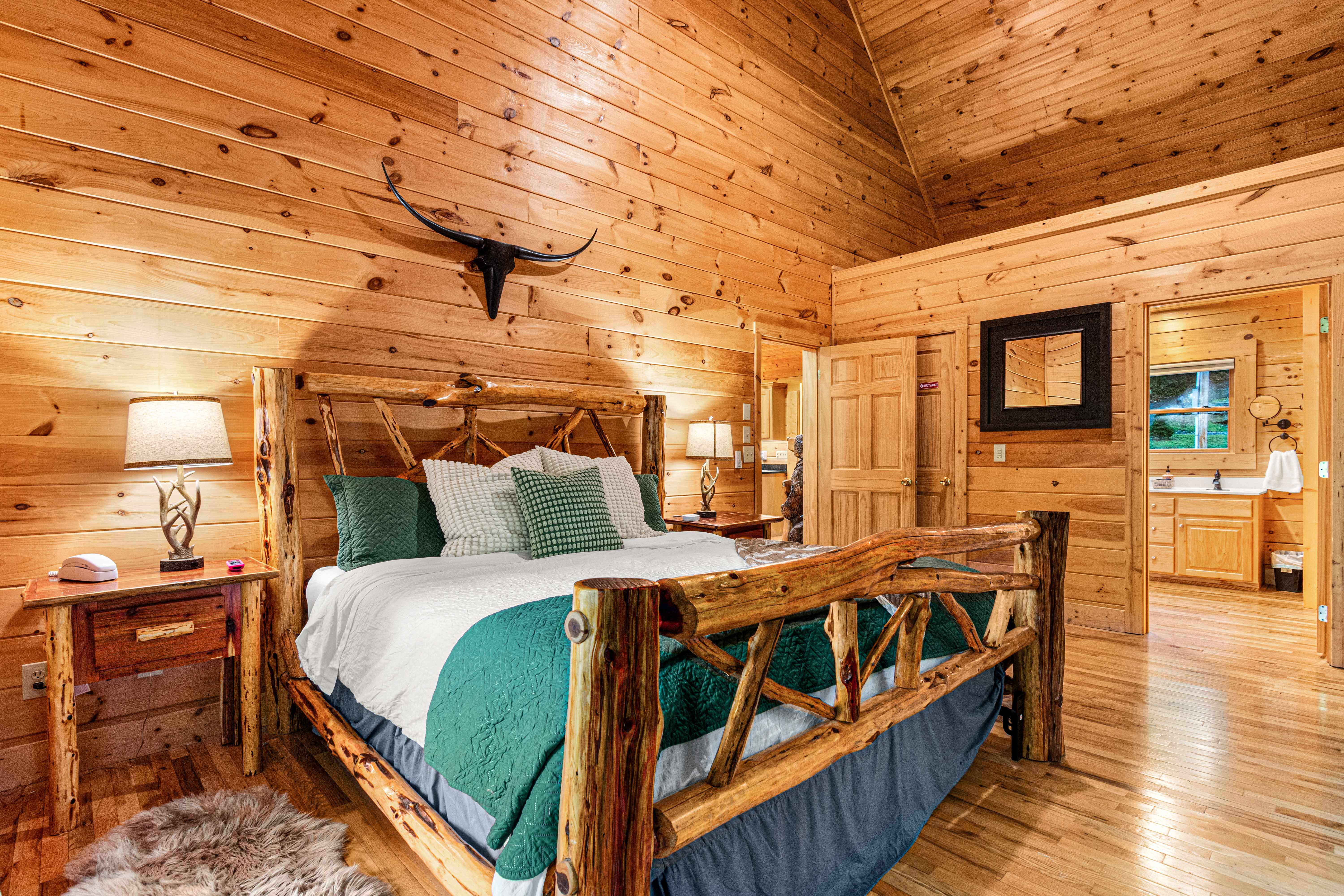 Primary bedroom with custom log king bed and nightstands. All beds include fresh and extra soft linens for an ultimate night's sleep!