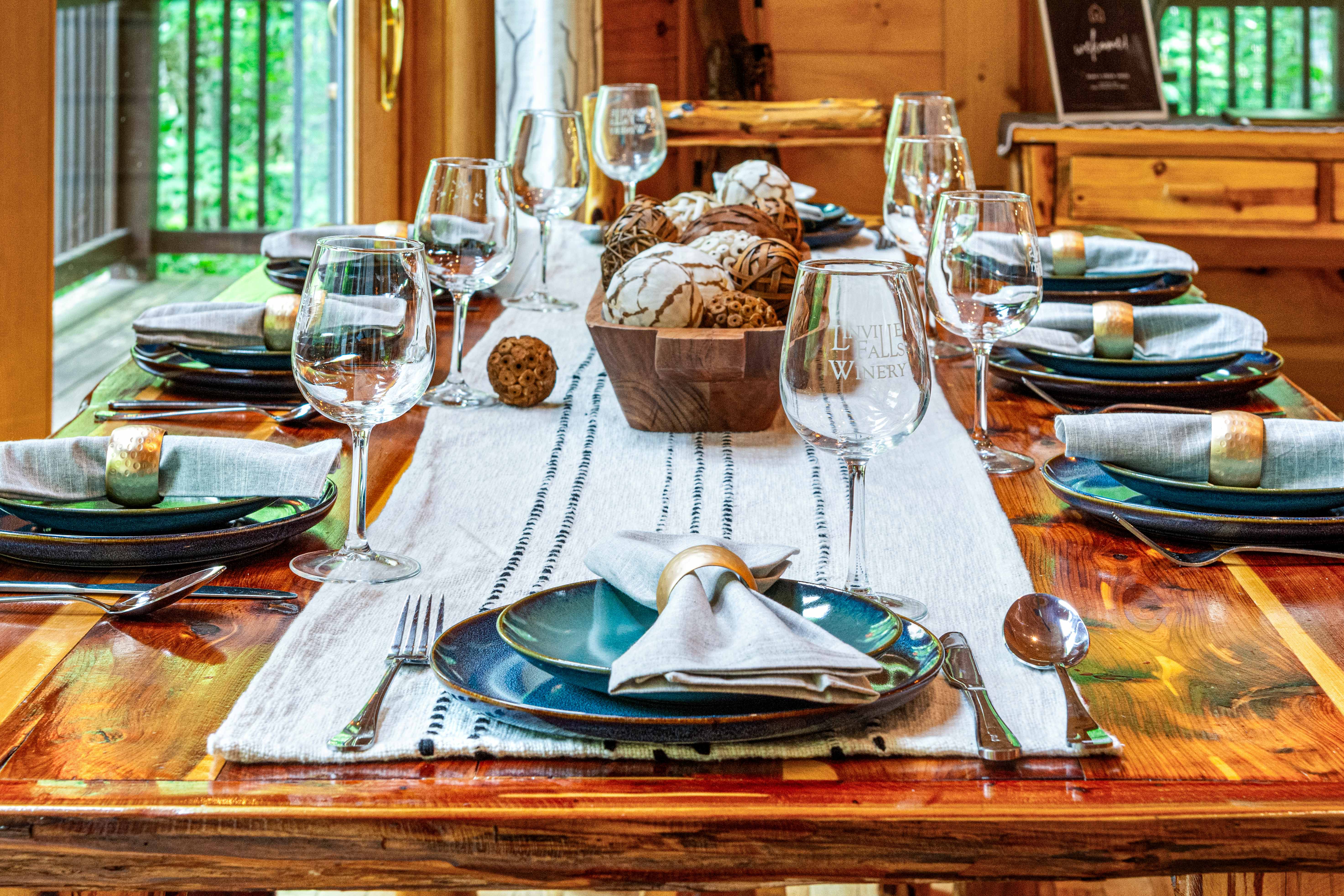 Dine at the 10-12 person custom log dining table for delicious meals with family and friends.